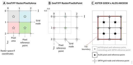 (A) GeoTIFF RasterPixelIsArea DEM where the grid nodes sit at the corners of the sampling area. (B) GeoTIFF RasterPixelIsPoint DEM where the grid nodes coincide with the sampling points which likely are at the center of the sampling area. (C) Difference between the elevation storage in the GeoTIFF files for the ASTER GDEM and ALOS AW3D30 DEMs.