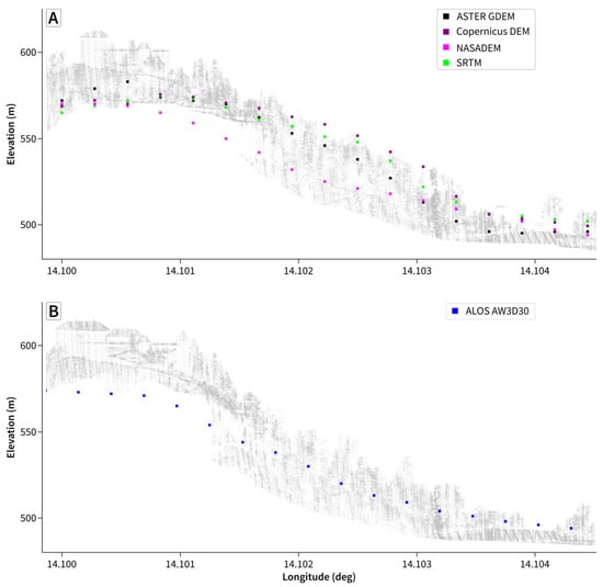 Profiles along a one arc second east-west slice through lidar point cloud in Bled, Slovenia and the points from (A) 4 global DEMs with common pixel representation, and (B) ALOS which has half pixel offsets compared to the others. As shown in Figure 6C, the area sampled by each ALOS pixel covers ¼ of the area of each of 4 pixels in the other DEMs. In this profile, half of the lidar points in the two profiles are the same, but the other half are to the north or south of the common points.