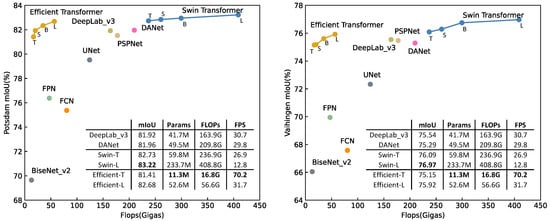 Flops vs. mIoU on the Potsdam and Vaihingen datasets.