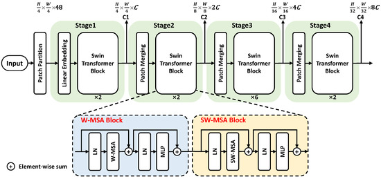 The structure of the Swin transformer backbone is shown in Figure 2. The overall framework is composed of a Patch Partition module and four cascade stages to produce four resolution outputs. The stage1 contains Linear Embedding and two Swin Transformer Blocks, the remaining stages contain a Patch Merging module and an even number (e.g., ×2) of blocks in each stage. Every two blocks are composed of a window multi-head self-attention (W-MSA) block and a shifted windows multi-head self-attention (SW-MSA) block to calculate the global attention.