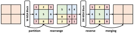 The specific design of the Swin transformer is the W-MSA, compared to traditional MSA calculating the relation in the whole image size, W-MSA calculates the attention relation in the window size, greatly reducing the amount of calculation. However, such a process also reduces the receptive field (e.g., from to ), which is unfavorable for the segmentation of large objects. Therefore, the Swin transformer adopts an ingenious design called SW-MSA to tackle this problem (shown in Figure 3).