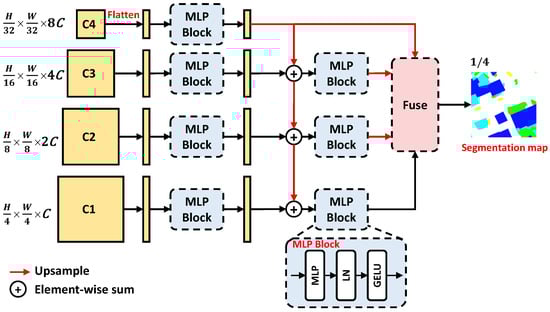 In addition, we adopt the cascade addition architecture to fuse different scale features and to improve the segmentation of multi-scale objects. Especially, the MLP Block is designed to accept sequence input, and so we flatten the input 2D features before feeding them to the MLP Block. Finally, we obtain four branches’ outputs to be fed into the Fuse block, upsampled to the same resolution. By fusing the four resolution features to generate the output segmentation map, the final results can be well suited for different scale inputs.