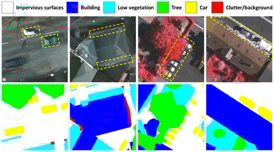 Vaihingen dataset (https://www2.isprs.org/commissions/comm2/wg4/benchmark/2d-sem-label-vaihingen/ accessed on 29 July 2021): The Vaihingen Dataset presents a relatively small village with many detached buildings, where the defined object categories are the same as the Potsdam dataset. The dataset was collected by an aerial camera with a resolution from to pixels. This dataset contains 33 samples, with 16 for training and 17 for testing. Unlike the Potsdam dataset, TOP of Vaihingen consists of NIR, R, and G bands so that TOP may look different from natural images (e.g., vegetation is red). In addition, it also contains the DSM and ground truth of the same number of categories.