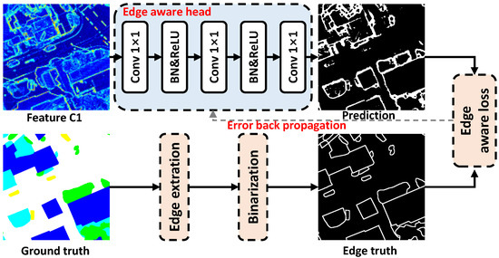 The edge aware head is composed of a simple combination of 1 × 1 convolution layer (Conv 1×1), batch normalization (BN) and ReLU activation function to map the features to two categories including edge and non-edge part. After the edge aware head, edge prediction is generated. Then, the below ground truth goes through a simple edge extractor (a kind of morphological processing method [36]) to obtain the edge truth.