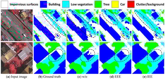 When combining explicit edge enhancement and implicit edge enhancement methods, the final mIoU obtains a 0.59% increase, and it seems that the effects of IEE and EEE are overlapping. We compare the results of adding IEE and EEE methods on the Vaihingen and Potsdam datasets in Table 9. The mIoU of Potsdam obtains a 1.06% increase, and the Vaihingen mIoU improves 0.59%. As the Potsdam dataset has more complex scenes, the Efficient-T without edge enhancement methods found it more difficult to predict a fine edge, and thus the edge enhancement methods may produce more obvious improvements.