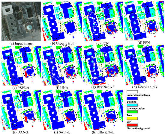 Previous experiments have deeply discussed the application of the Swin transformer in remote sensing tasks and verified our proposed Efficient transformer, mlphead, and edge enhancement methods. In this section, based on our previous experimental configuration and the same parameter settings, we compare some classic CNN models, including FCN [6], FPN [18], PSPNet [17], UNet [14], BiseNet_v2 [23], DeepLab_v3 [16], and DANet [19], as well as the Swin transformer studied in this article. The Efficient transformer with mlphead model, including Efficient-T, Efficient-S, Efficient-B, and Efficient-L are compared.