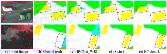 The results are shown in Table 12. First, observing the results on the Vaihingen dataset, it can be found that transformer-based methods were significantly better than the CNN methods in most of the accuracy metrics by taking HRCNet_W48 as the benchmark. On the Potsdam dataset, Efficient-L and Swin-L also easily outperformed the CNN-based methods in all the accuracy metrics. When using the same TTA strategy, Efficient-L outperformed Swin-L on mIoU, presenting that Efficient-L can obtain higher benefits from TTA.