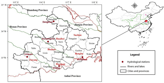 The study area is located in the northern Anhui province, which resides on the northern part of the mainstream Huaihe River, with a total area of 42,200 km2. As shown in Figure 1, it is also located on the south borders of Shandong, Henan, and Jiangsu provinces, which are within the hinterland of the central economic zone of China. The drought-affected area in this region is approximately 53% of the total provincial arable land area [18,19,20]. Meanwhile, the northern Anhui province lies in the transitional zone of the subtropical zone and warm temperate zone, with obvious transitional climate characteristics. The southeast wind prevails in spring and summer, and the climate is warm and humid; meanwhile, the northwest wind prevails in autumn and winter, and the climate is cold and dry. The annual average precipitation in this region is about 850 mm. The seasonal allocation and temporal distribution of precipitation vary significantly due to the influence of global climate change, which leads to the alternation of cold and warm seasons and the occurrence of drought disasters more frequently as well in the northern Anhui province.