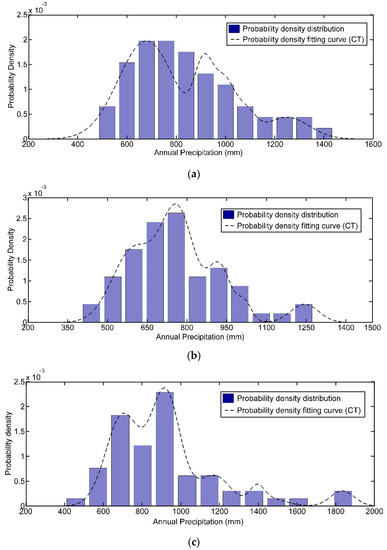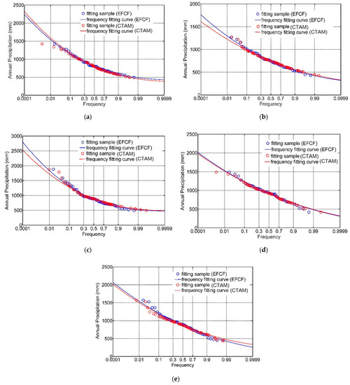 Considering the deficiencies of the Pearson type III function-based approach for hydrological frequency analysis and disagreement of different estimation formulas of sample empirical frequency, the CTAM model for annual precipitation frequency-curve-fitting analysis was recommended in this manuscript. More specifically, the realization procedures of the CTAM model for the cumulated distribution frequency-curve-fitting of annual precipitation could be explained as follows [17,23]: