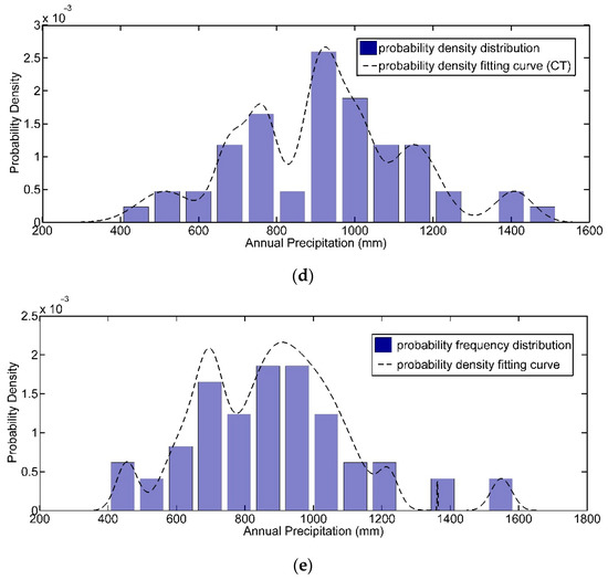 Distribution of probability density fitting curve of annual precipitation in north Anhui province, China. (a) Guoyangzha Station; (b) Dangshan Station; (c) Linquan Station; (d) Mohekou Station; and (e) Xifeihezha Station.