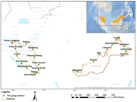 The data employed to accomplish the aim of this study were acquired from different sources. These data had different formats and dimensions, as presented in Table 1 below. The table also provides information on the source of the data and their specific use in this study. To quantify sea-level change over the study area, monthly averaged sea-level data were acquired from the Permanent Service of Mean Sea Level (PSMSL) and Copernicus Marine Environment Service (CMEMS), respectively. PSMSL provides high-frequency sea-level data measured by tide gauges, while CMEMS provides multi-mission altimeter satellite gridded sea-level anomalies (SLAs). A total of 21 tide-gauge stations cover the Malaysian coastline—12 of these stations are along the coast of Peninsular Malaysia (West Malaysia), and 9 tidal stations are along the coast of Sabah and Sarawak (East Malaysia) (Figure 1).