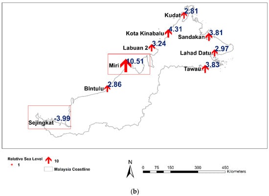 Relative sea-level trends at (a) the Peninsular Malaysia coastline and (b) Sabah and Sarawak. The values estimated for the stations in red rectangles were uncertain due to the unreliability of the tide-gauge record.