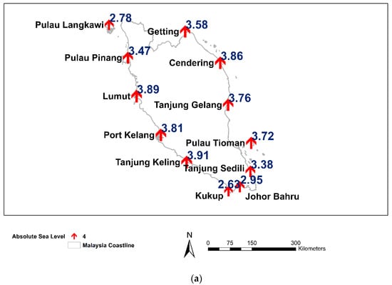 Relative and absolute sea-level trends estimated for the Malaysian coastline are presented in Figure 4 and Figure 5, respectively.