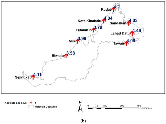 Absolute sea-level trends at (a) the Peninsular Malaysia coastline and (b) Sabah and Sarawak.