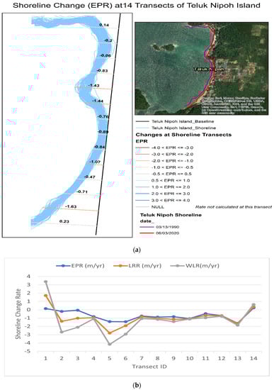 (a) Map of shoreline change rate (EPR). (b) Plot of shoreline change rate for EPR, LRR, and WLR.