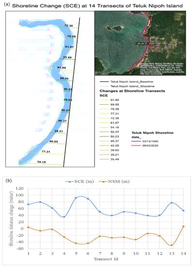 (a) Map of shoreline change (SCE). (b) Plot of shoreline distance change for SCE and NSM.