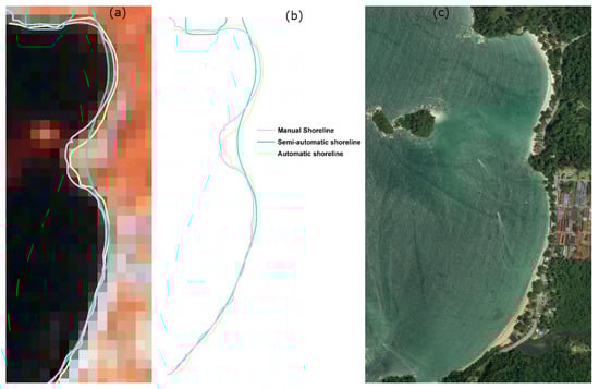(a) Band 4, 5, 7 composite of Landsat 7 and extracted shorelines. (b) Manual, semi-automatic, and automatic shorelines extracted from the image. (c) Base map imagery of the study area (base map by Google Satellite).