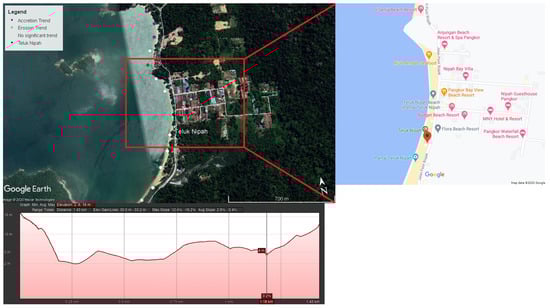 The impact of the high density of human population and activities, such as the development of residential areas, industries, tourist destinations, and commercial projects, as well as construction of harbours and jetties, was observed in some coastal areas. As one of Malaysia’s most popular recreational beaches [52], Teluk Nipah, for example, witnesses a high inflow of tourists annually, and is thus a region of high anthropogenic activity. The growing human activities have influenced commercial developments in the area. Figure 9 shows the development and profile of Teluk Nipah Beach. Restaurants, hotels and resorts, homestays, and hawker stalls were distributed along the coastline, but were concentrated at the mid-section, thereby exerting enormous pressure on this region. Inspection of the landscape revealed erosion in this region of intense activities and development. The erosion regions were concentrated in areas showing restaurants, homestays, resorts, hawkers stalls, and commercial shops along the coastline. The beach profile revealed a downward slope from the eroding mid-section to the upper north section of the beach. We believe that this arrangement enabled the eroded sediments from the mid-sections to be transported to the lower elevation upper section. The accretion observed at the end section was perhaps due to this longshore transportation of eroded sediments from the higher elevation mid-sections of the coast. Foo, Teh and Babatunde [52] had previously reported this contribution of sediment supply over the test site. The study conducted an analysis of the grain-size distribution of the soil sample using a sieve analysis, and discovered that the sediment in the northern region was finer than that in the southern region. It was later discovered during site studies that the southern beach’s top sand had been covered by a thin layer of finer, brighter sand. The fine sand was reported to have been transported from the beach in the northern region by sediment movement along the shore. Although shoreline erosion is connected to energetic (e.g., sea-level rise, marine regime, and winds) and mass balances (e.g., the inputs/outputs of sediments), this study largely considered the impact of SLR on shoreline dynamics. In future studies, adopting a more holistic approach by considering other pertinent parameters could provide further insights into shoreline dynamics.