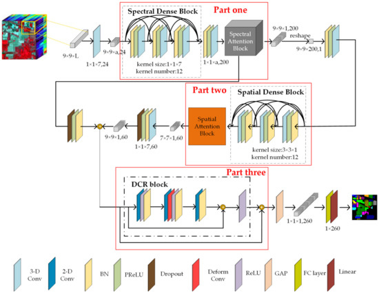 In this study, the proposal of the DCR block is motivated by DHCNet [26] and by residual networks (ResNets) [42]. The DCR block is generated by combining a deformable convolution layer with a traditional convolution and residual branch. Part D of this section provides a comparison of the results of the classification accuracy and the numbers of parameters with and without the DCR block. This block is utilized to further extract high-level spatial features, which can not only extract spatial features more fully but also prevent the classification accuracy from decreasing with increases in the network depth.
