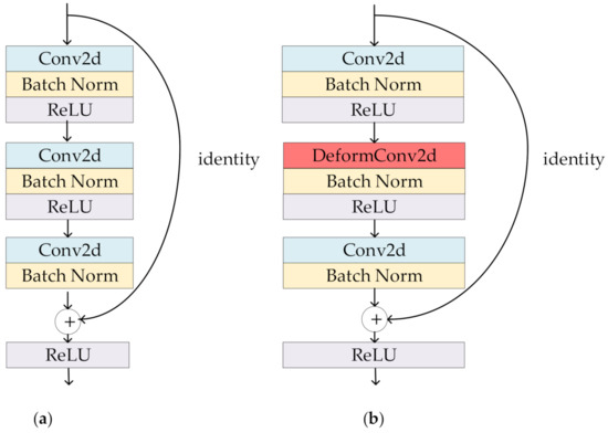Because the number of feature maps of and is the same, is the identity map, that is, , which is reflected as the arc on the right side of Figure 5b; is the residual part, which consists of two regular convolutions and one deformable convolution, followed by BN layers and a ReLU layer [46], which corresponds to the part with convolution on the left side of Figure 5b, where and are the input feature map and weight.