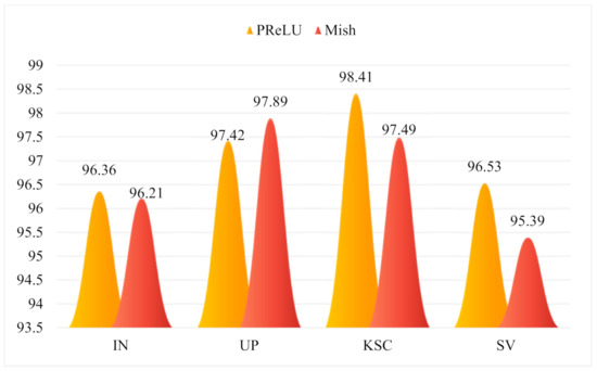 here, represents the input of the activation. Moreover, Mish has a smoother gradient compared to that of ReLU. Figure 6 shows the comparison results of the overall classification accuracy on each dataset using Mish or PReLU. It can be seen from Figure 6 that the overall accuracies on the three datasets with the PReLU activation function are all higher than those with the Mish activation function. Therefore, PReLU was adopted in this study.