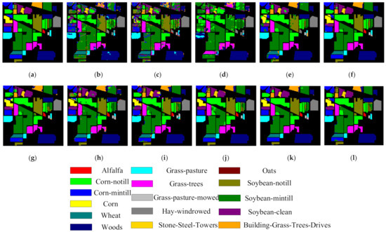 Full classification maps on the Indian Pines image obtained with the (a) ground truth, (b) KNN (OA = 55.61), (c) SVM-RBF (OA = 77.58), (d) CDCNN (OA = 62.20), (e) SSRN (OA = 93.32), (f) FDSSC (OA = 94.79), (g) DHCNet (OA = 95.19), (h) DBMA (OA = 89.78), (i) HybridSN (OA = 87.46), (j) DBDA (OA = 95.45), (k) LiteDepthwiseNet (OA = 95.59), and (l) proposed method (OA = 96.36).