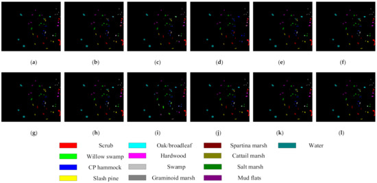 Full classification maps on the Kennedy Space Center images obtained with the (a) ground truth, (b) KNN (OA = 79.98), (c) SVM-RBF (OA = 84.97), (d) CDCNN (OA = 80.91), (e) SSRN (OA = 96.06), (f) FDSSC (OA = 97.58), (g) DHCNet (OA = 97.41), (h) DBMA (OA = 95.07), (i) HybridSN (OA = 63.72), (j) DBDA (OA = 97.59), (k) LiteDepthwiseNet (OA = 97.41), and (l) proposed method (OA = 98.41).