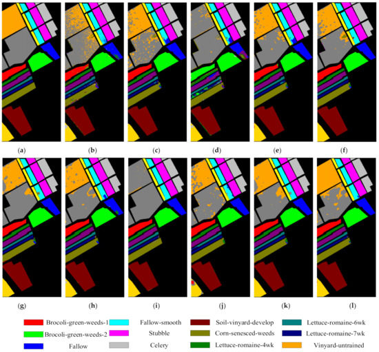 Full classification maps on the Salinas Valley images obtained with the (a) ground truth, (b) KNN (OA = 82.17), (c) SVM-RBF (OA = 88.09), (d) CDCNN (OA = 80.51), (e) SSRN (OA = 90.11), (f) FDSSC (OA = 94.60), (g) DHCNet (OA = 94.45), (h) DBMA (OA = 92.62), (i) HybridSN (OA = 95.05), (j) DBDA (OA = 95.81), (k) LiteDepthwiseNet (OA = 97.02), and (l) proposed method (OA = 97.46).