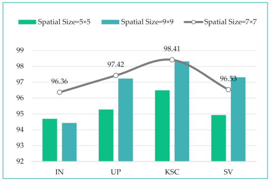 (1) It is well known that a target spectral pixel and its surrounding spatial neighborhood usually belong to the same category. Therefore, the spatial size of the input cube has a great impact on the classification performance. If the spatial size of the input cube is too small, the receiving field for feature extraction will be insufficient, resulting in a loss of information and reduced classification performance; if it is too large, the local spatial features cannot be effectively extracted, and the computational cost and memory demand will be drastically increased. Figure 11 shows the OA values of the four datasets with different patch sizes, which varied from 5 × 5 to 9 × 9 with an interval of 2. In Figure 11, as the spatial size of the input cube increases, the OAs of the IN, UP, and KSC datasets begin to decline after 7 × 7, where they reach the highest values of 96.36%, 97.42%, and 98.41%, respectively. For the SV dataset, the OA keeps increasing as the spatial size of the input cube increases. Through the analysis of the experimental results on the four datasets, it was found that the 7 × 7 spatial patch size was able to provide the best performance, so this study used 7 × 7 as the spatial input size.