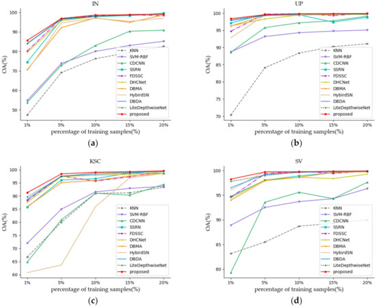 Classification results (OA%) with different amounts of training samples on four datasets. (a) IN. (b) UP. (c) KSC. (d) SV.