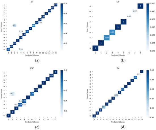 Confusion matrix using the proposed method for (a) IN, (b) UP, (c) KSC, and (d) SV.