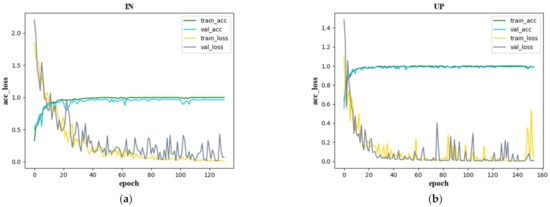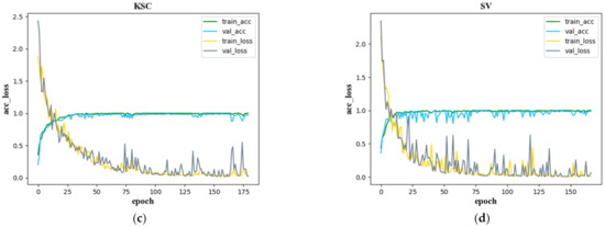 Accuracy and loss function curves of the training and validation sets for (a) IN, (b) UP, (c) KSC, and (d) SV.