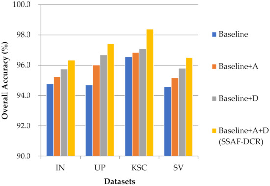 The proposed method uses three modules: dense blocks, attention blocks, and DCR block. In order to verify their respective performance, in this paper, the network composed of two dense blocks is taken as the baseline network. On this basis, attention blocks (abbreviated as A) and DCR block (abbreviated as D) are respectively added to form the baseline + A network and baseline + D network. Attention blocks and DCR block are also together added to the baseline network to form a baseline + A+ D network (i.e., the proposed SSAF-DCR network). The ablation experiments and analyses of these three networks were performed on four data sets as shown in Figure 15. It can be seen that because the DCR block has made effective adjustments to the receptive field, it has better adapted to spatial changes and further extracted spatial features; while the attention block has selectively screened and aggregation the previously extracted features, so only adding the DCR block has an improvement in the OA value on the four data sets compared to only adding the attention block. Due to the good combination of the advantages of attention block and DCR block in feature extraction, it is obvious that the baseline + A + D network (i.e., the proposed SSAF-DCR network) composed of the two achieves the best classification accuracy on the four datasets.
