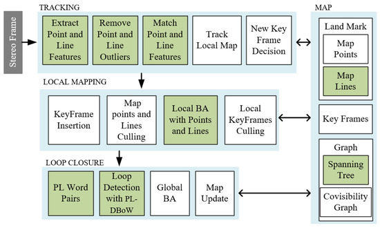 The schematic diagram of the PEL-SLAM system proposed here is illustrated in Figure 1. Since the PEL-SLAM system is improved on the basis of ORB-SLAM2, most modules of the system are the same as the ORB-SLAM2 system except for the green part in Figure 1.