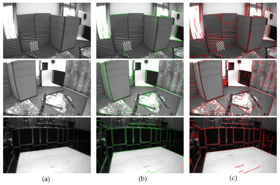 The extracted lines of LSD and EDlines in the EuRoC dataset [33]. (a)The original images. (b) The green lines in the left column are the line features detected by LSD. (c) The red lines in the right column are the line features detected by EDlines.