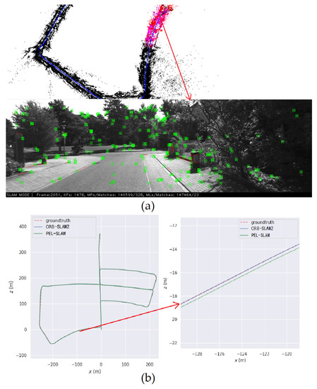An example of the PEL-SLAM on KITTI 05. (a) Feature extraction and mapping of PEL-SLAM. (b) Trajectory comparison between ORB-SLAM2 and PEL-SLAM.