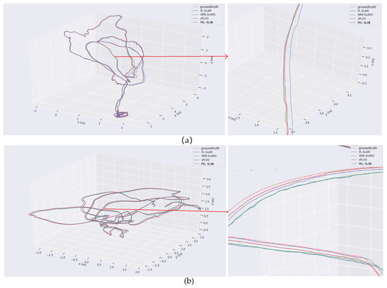 Trajectory comparison between PL-SLAM, ORB-SLAM2, sPLVO, and the proposed PEL-SLAM. (a) The 3D view of the estimated trajectories on EuRoC MH-02. (b) The 3D view of the estimated trajectories on EuRoC V1-01.
