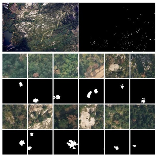 We generated training samples from annotated images as follows. First, 200 images with a resolution of 256 × 256 pixels were clipped from an UAV image with a resolution of 7952 × 4472 pixels, and each clipped image included pixels of infected pines. Then, the annotated full-resolution image was rotated by 5°, 10°, and 15°, and for each rotated image, 200 images were clipped randomly. We did not change the brightness of the image because there were some mountain shadows in the UAV images (image in Figure 3, top-left corner). Overall, 36,000 samples with a resolution of 256 × 256 pixels were obtained. We split the obtained samples into 50% for training, 20% for validation, and 30% for testing.