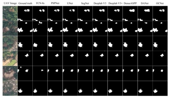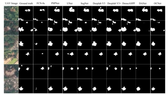 Figure 4 demonstrates that all the models suitably detected infected pines, and no background objects were falsely recognized as infected pines. Nevertheless, some models missed various pixels corresponding to infected pines, while others misclassified uninfected pines as infected ones. For instance, FCN-8s, DANet, and OCNet often missed more pixels of infected pines, and U-Net, PSPNet, and SegNet provided several false positives. Remarkably, FCN-8s predicted the smallest area of infected pines, especially for the images in the fourth and sixth rows. However, U-Net misclassified pixels corresponding to uninfected pines as indicating infected pines, as in the images in the first and second rows. While no models missed considerable infected pines, the predicted boundaries were inaccurate, but a detailed boundary was important to obtain the morphological characteristics of infected pines.