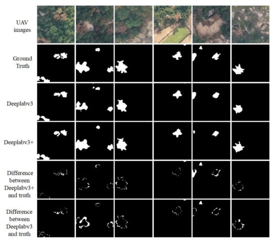 Figure 6 displays the difference between segmenting the results of DeepLabv3 and DeepLabv3+ using the highest-performing ResNet34 backbone. The white pixels in the fifth and sixth rows represented the segmentation results of DeepLabv3+ and DeepLabv3 subtracted from the ground truth, respectively. Compared with DeepLabv3, DeepLabv3+ segmenting was closer to the ground truth, providing a finer boundary, which was achieved by the decoder.
