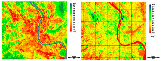 Although the data are from different years, and therefore the absolute values are different, a comparison between Figure 2 (left) and Figure 7 (left) shows a similarity concerning the spatial pattern of longwave emissions. Nevertheless, the most striking difference is the Rhine River, which is colder during the day and warmer at night compared to the urban pixels. In reality, water temperatures do not change much from the day hours to the night hours (≈0.5–1 K) due to the high heat capacity of water. Actual data of all the Basel urban climate network stations can easily be accessed through https://mcr.unibas.ch/dolueg2/index.php?project=overview [].