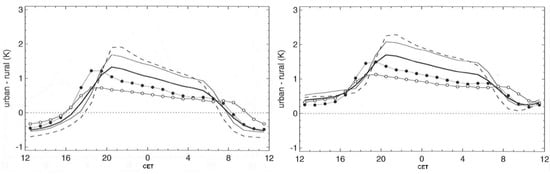 Mean diurnal course of air temperature differences (urban–rural) for the period 1994–2003 between the urban flux stations Basel-Spalenring (roof level, 32 m AGL) and the rural station Basel-Lange Erlen (2 m above ground) (left), and Basel- Spalenring (street level, 3 m AGL) and Basel-Lange Erlen (2 m AGL) (right) (–– spring, - - - summer, ●-● autumn, ◦-◦ winter, and –– annual mean) []. Note that time axes (X-axes) are midnight centered (X-axis in Central European Time).