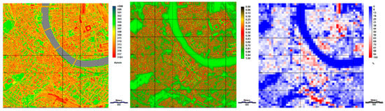To show these results, a one night-TIR scene from ASTER (13 May 2012, satellite overpass at 21:12 UTC (22:12) CET) was downloaded. To compute net radiation at night, the mean atmospheric counter-radiation measured at three urban flux tower stations in Basel was 264.5 Wm−2, ranging from 259 to 270 Wm−2. Then, longwave emissions (Figure 7 left) from satellite data were reduced by this factor to obtain nocturnal net radiation distribution (Figure 7 right).