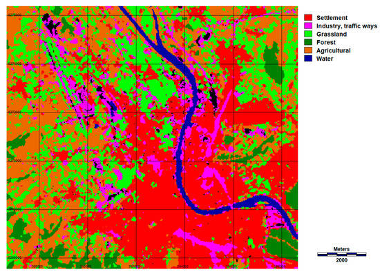 For a more appropriate comparison, Figure 6 shows the generalized land use/landcover of the study area reduced to six major classes, as computed from Landsat-ETM data. Much of the area is settlement, industry, or important traffic ways such as railway stations, the airport in the northwest, etc. The water surface of the Rhine River bends through the city center to the north, and some small dredging lakes towards the airport are related to gravel excavation. Grassland and agricultural fields are located at the northern and western edges of the image. For further comparison, Figure 6 covers the same area as Figure 7 (left and right).