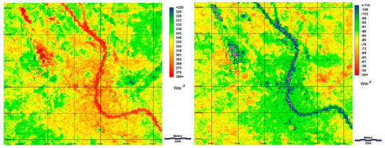 Possibility b. could be a solution if net radiation is not strongly reduced and stays on a normal level. However, this is not the case. Daytime surfaces in urban areas are often 15–20 K warmer than their rural surroundings, which corresponds to a higher longwave emission of 70–100 Wm−2, which automatically reduces net radiation by these values at least. On the other hand, in most urban areas, a reduction in net radiation is not balanced by an equivalent reduction in latent heat, resulting in a similar sensible heat flux. Although an urban surface is impervious, the latent heat flux is not equal to zero. In most cities, a certain latent heat flux remains due to vegetation along streets or in backyards and urban parks. During the BUBBLE field campaign, mean daytime latent heat flux at flux tower sites in the city center was about −100 ± 20 Wm−2 []; this was also apparent during the recent URBANFLUX study [,]. Figure 2 shows longwave emissions from 2 August 2002, in the city of Basel, Switzerland. Data are from Landsat-7-ETM, and they are atmospherically and emissivity corrected. During an intensive urban climate field campaign named BUBBLE (Basel Urban Boundary Layer Experiment) [], all radiation and heat fluxes, vertical profiles at 30 m flux towers, etc., were measured at numerous stations within the city of Basel and at several rural stations. In Figure 2, one can see the Rhine River flowing through the city of Basel and bending to the north. In the northwestern part of the area, one easily can see the international airport Basel-Mulhouse with its runways. Longwave emissions span a range between 418 and 530 Wm−2, which corresponds to a surface temperature range between 20 °C (Rhine River) and 38 °C (city center and airport). On the right side, net radiation Q* at a satellite overpass on 2 August 2002, is shown. The range is from about 200–800 Wm−2. To compute the net radiation of the whole area, spatially distributed solar irradiance was calculated using a numerical model [,], and calibrated by local measurements at seven urban and rural flux towers; shortwave reflection was computed using a linear combination of Landsat visible bands, and atmospheric counter-radiation was assumed to be constant in that small area. For further information, I refer you to Rigo and Parlow []. The basic statement of Figure 2 is that areas with the highest LST have the lowest net radiation of Q*. The water surface of the Rhine River is colder (low emission loss) and darker than the urban areas (low albedo—low shortwave reflection loss), and it reaches a net radiation of about 800 Wm−2; however, since heat fluxes into the water body are extremely turbulent and the heat capacity of the water is high, this does not result in increased water temperatures. Net radiation of the warm surfaces in the city is in the range of 500–550 Wm−2, and the extremely hot (38 °C) surfaces at the airport reach a net radiation of 250–300 Wm- 2. These values are due to the high longwave emissions and increased shortwave reflectance of light concrete parking surfaces. This also means that the warm surfaces of the airport have 200–300 Wm−2 less energy available for the heat budget (especially sensible and storage heat flux).