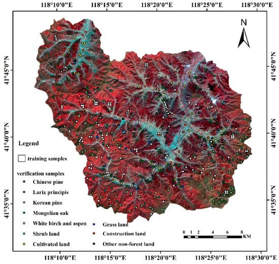 In addition, in order to verify the classification accuracy of the deep learning model, field surveys in the Wangyedian forest farm were conducted in September 2017 and 2019 to validate the proposed model’s classification accuracy. As indicated in Figure 3, a total of 358 field survey samples were collected. The square area in Figure 3 is the spatial distribution of part of the training sample blocks, and the circular area is the distribution of collected test sample points.
