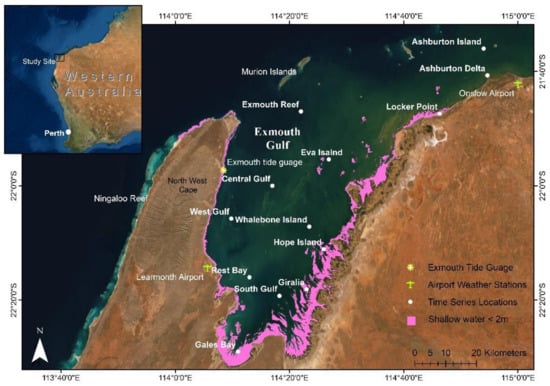 The study site, Exmouth Gulf, located in northern Western Australia. Symbols represent 13 locations where long-term turbidity and its metocean drivers are analysed, location of the Exmouth tide gauge and location of the airport weather stations. Pink areas denote shallow water where satellite derived bathymetry estimates depths of less than two metres during lowest astronomical tides. Note: Some sites are named for their proximity to known landmarks and may not represent the exact location of that landmark. Basemap images are from Environmental Systems Research Institute (ESRI) Online.