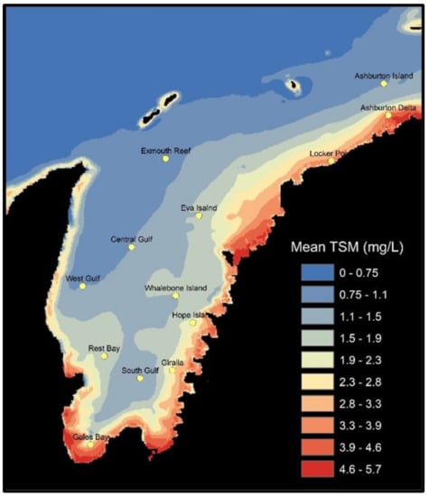 A single band total suspended matter (TSM) algorithm based on the red band reflectance at 667 nm was applied to all scenes. Reflectance at this wavelength is sensitive to the concentration of suspended sediments [15]. The algorithm employed here was developed by Dorji and Fearns [51] and was calibrated and validated with in situ measurements in the same optically complex waters of this study region. In moderately turbid waters the algorithm detects sediments in the top approximately 50 cm of water and is considered robust at depths greater than approximately 2 m in mildly turbid waters [51]. As some near-coastal regions of the Exmouth Gulf may be shallower than 2 m during some tidal cycles (Figure 1), some caution should be applied to the analysis of these regions.