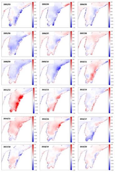 Anomaly maps showing the years 2002–2020 (1 July–30 June) where mean turbidity is higher (red) or lower (blue) than the overall mean turbidity for the entire period.