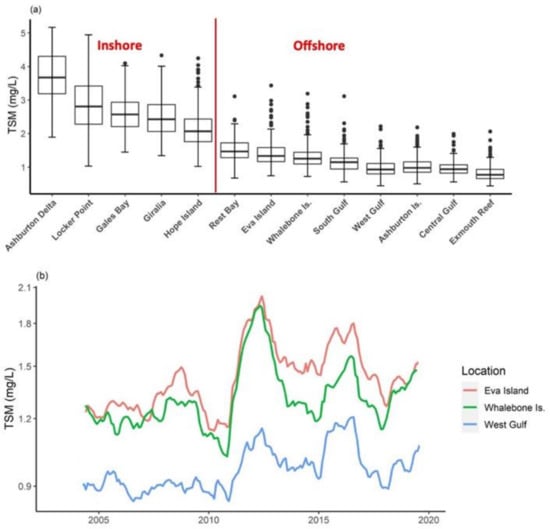 (a) Monthly total suspended matter (TSM) variability at 13 locations in the Exmouth Gulf between 2002 and 2020 showing median, interquartile ranges, max/min, and outliers; offshore refers to locations more than 3 nautical miles from the coastline. (b) TSM time series (18-month rolling mean) at three locations where there was an increasing trend of monthly average TSM from 2002 to 2020 (modified Mann–Kendall p < 0.05).
